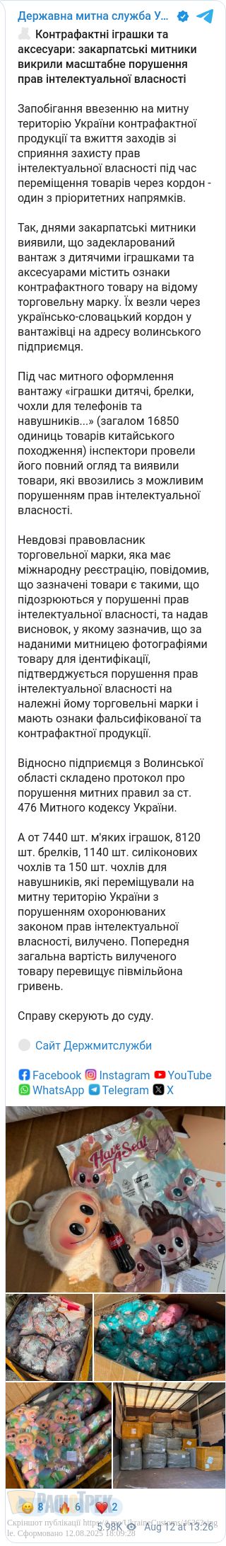 На підприємця з Волинської області склали протокол про порушення митних правил. А 7 440 м'яких іграшок, 8 120 брелоків, 1 140 силіконових чохлів та 150 чохлів для навушників вилучили. Попередньо загальна вартість вилученого товару перевищує півмільйона гривень.