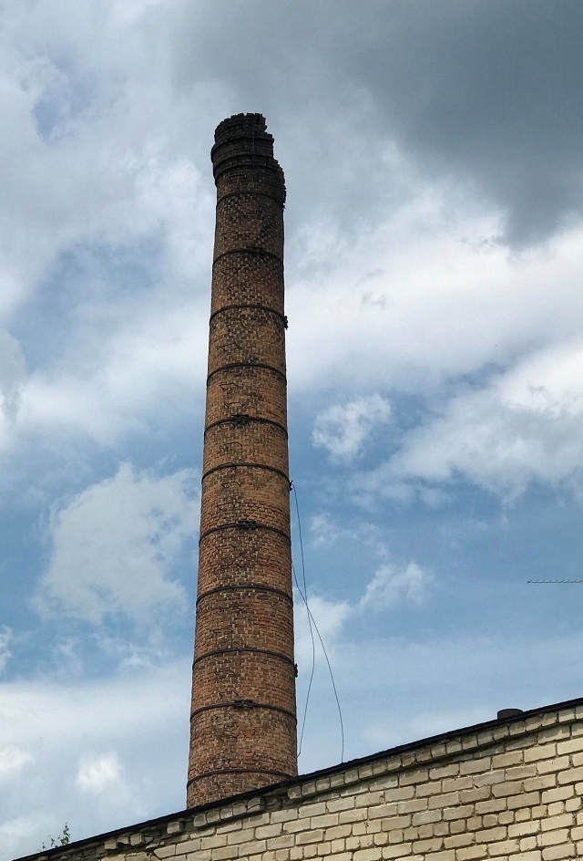 Крім того, на трубі помітно тріщини цегляної кладки верхньої частини (приблизно ¼ висоти) та відхилення по вертикалі верхньої частини (на стільки ж) димової труби у бік котельного залу та прального відділення лікарні.