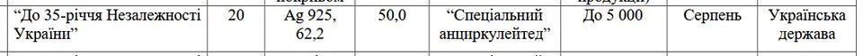 Очікується, що монета з’явиться у серпні. Її назва — «До 35-річчя Незалежності України», а виготовлять її зі срібла 925-ї проби.