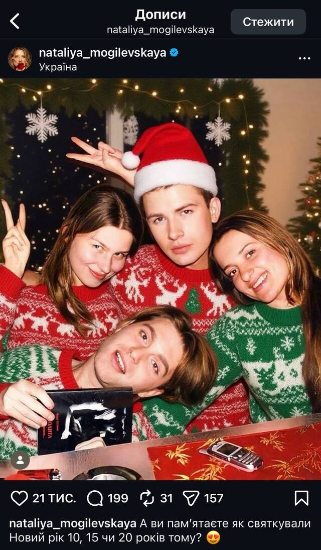 Наталія Могилевська викликала хвилю зворушення у мережі, поділившись теплим спогадом із минулого. Артистка опублікувала рідкісний архівний знімок, на якому вона зображена біля новорічної ялинки разом із зовсім молодим Андрієм Данилком та близькими друзями.