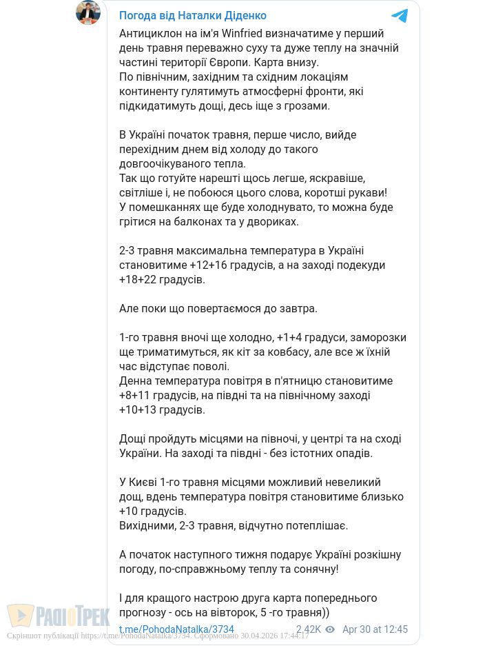 В Україні початок травня вийде перехідним днем від холоду до такого довгоочікуваного тепла.