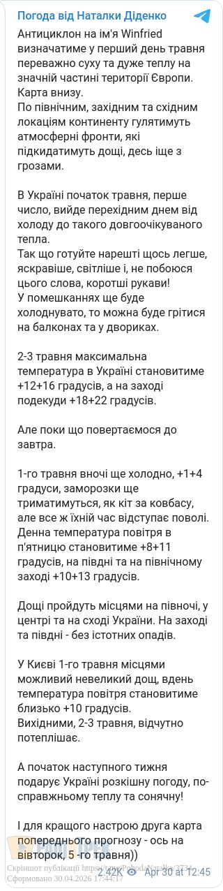 У перший день травня над Європою пануватиме антициклон на ім'я Winfried. Завдяки ньому повсюди буде переважно сухо та дуже тепло.