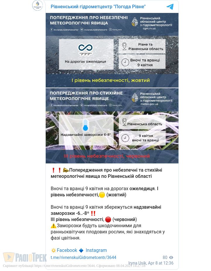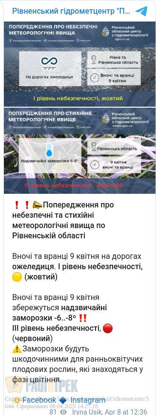 Найближчої ночі та вранці 9 квітня в області пануватимуть надзвичайні заморозки до -6...-8 градусів. Це ІІІ рівень небезпеки, «червоний», повідомили в обласному гідрометцентрі.