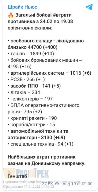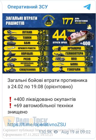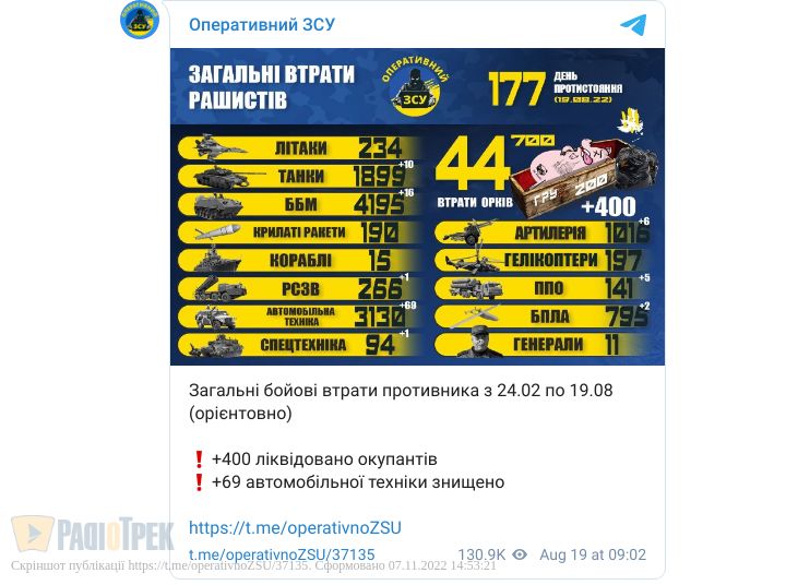 Як свідчить статистика, ЗСУ за минулу добу завдали чималих втрат ворогу у живій силі та техніці.
