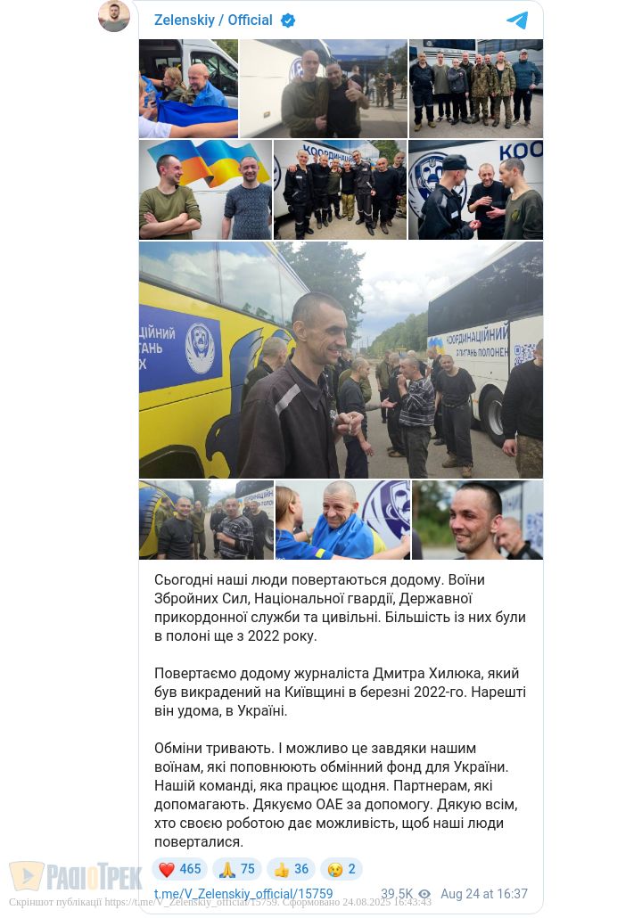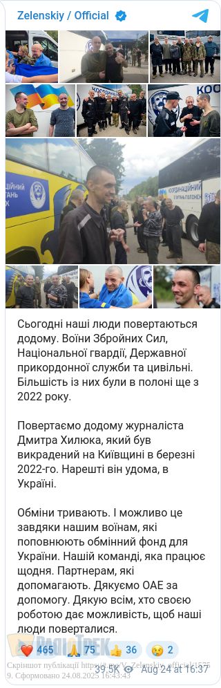 Сьогодні, 24 серпня, між Україною та росією відбувся черговий обмін військовополонених. Додому повернулися воїни ЗСУ, Нацгвардії, прикордонники та цивільні. Наймолодшому з них — 26 років, найстаршому — 62.