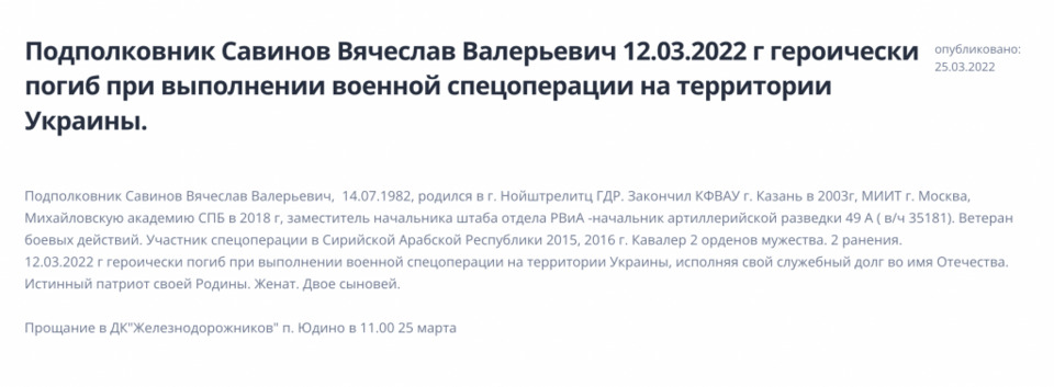 Ліквідовали начальника артилерійської розвідки 49-ї загальновійськової армії рф, підполковника В’ячеслава Савінова.