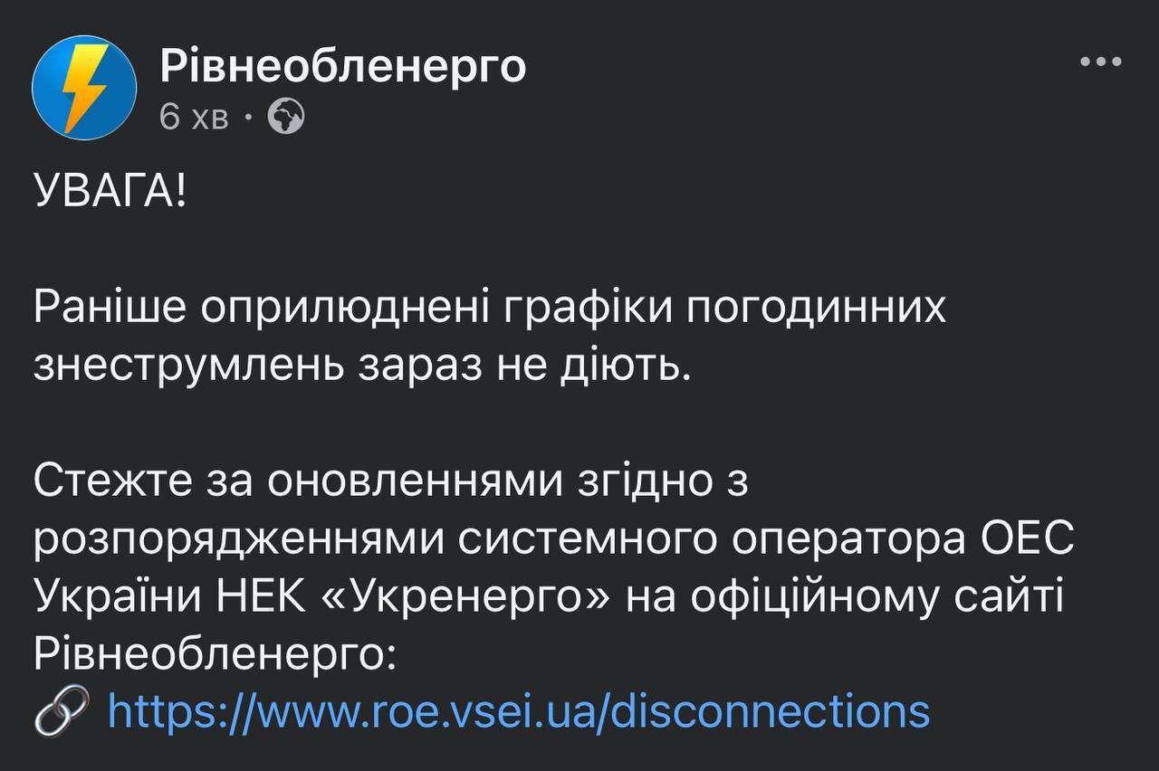 Нагадаємо, внаслідок російської атаки на Рівненщину, в області запровадили аварійні відключення електроенергії.