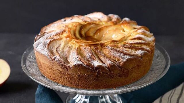 Випікайте в духовці 35 хвилин при 180C, потім вийміть і залиште остигати на 10 хвилин. Обережно переверніть пиріг на підставку для торта так, щоб сторона з фруктовою начинкою була спрямована вгору.