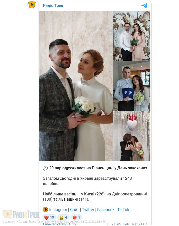 Загалом 14 лютого в Україні зареєстрували 1248 шлюбів.