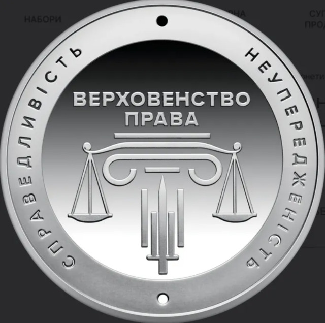 - Реверс прикрашає колона з терезами — символ правопорядку, а також слова: «Верховенство права», «Справедливість», «Неупередженість».