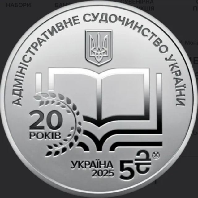 НБУ випустив нову пам’ятну монету номіналом 5 грн, присвячену 20-річчю адміністративного судочинства в Україні. Вартість — 179 грн, придбати можна лише 1 монету на особу.