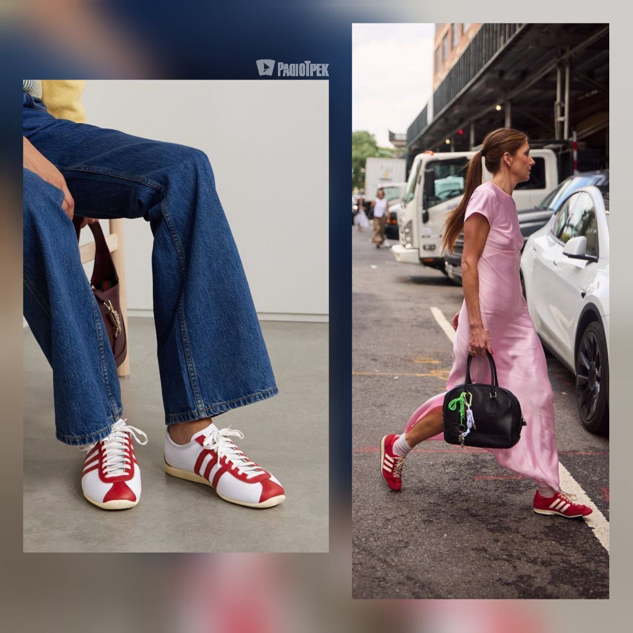 Білі кросівки ще актуальні, але тепер увага модників прикута до кедів у стилі 70-х. Шукайте моделі з замші чи незвичних текстур, особливо у складних кольорах — сіро-коричневому, оливковому, червоному. Вони додають образу настрою «вінтаж з характером».