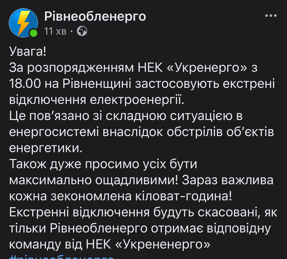 Відключення триватимуть до стабілізації ситуації та отримання команди про їх скасування від «Укренерго».
