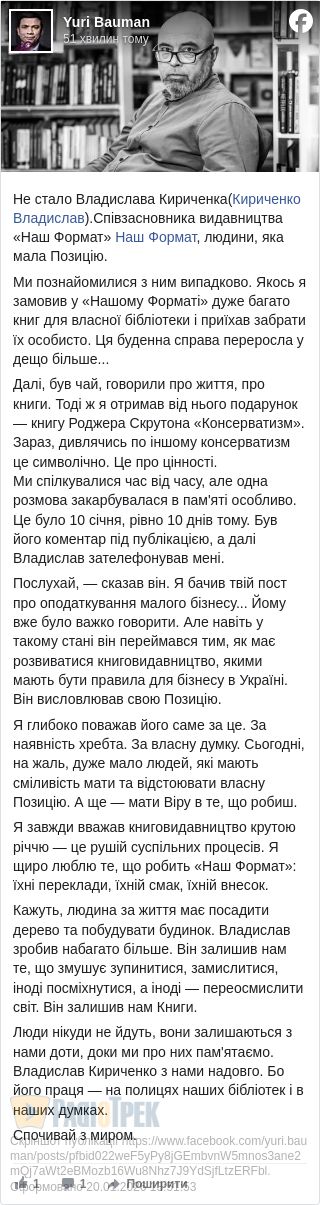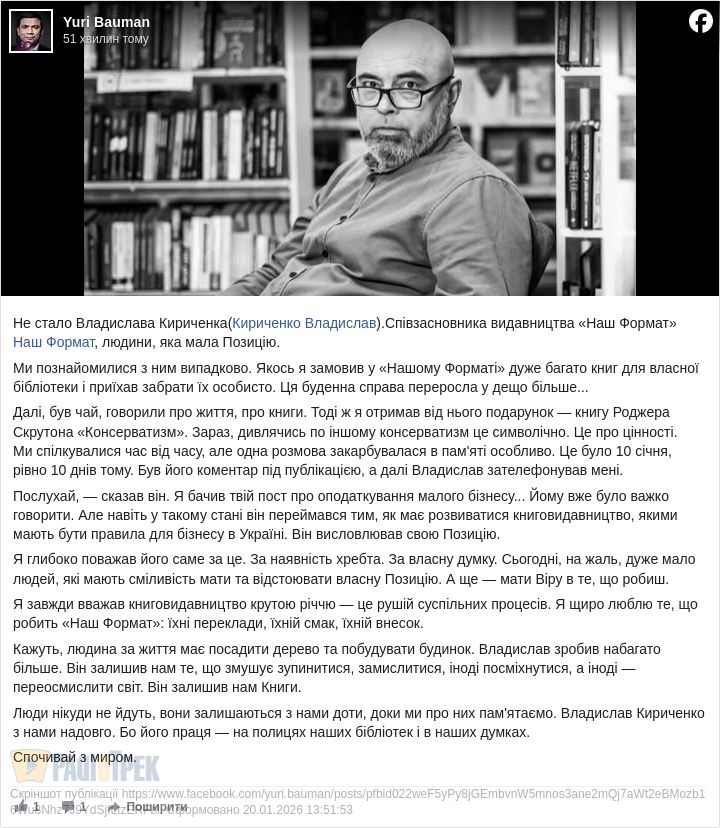 - Не стало Владислава Кириченка (Кириченко Владислав). Співзасновника видавництва «Наш Формат» Наш Формат, людини, яка мала Позицію.