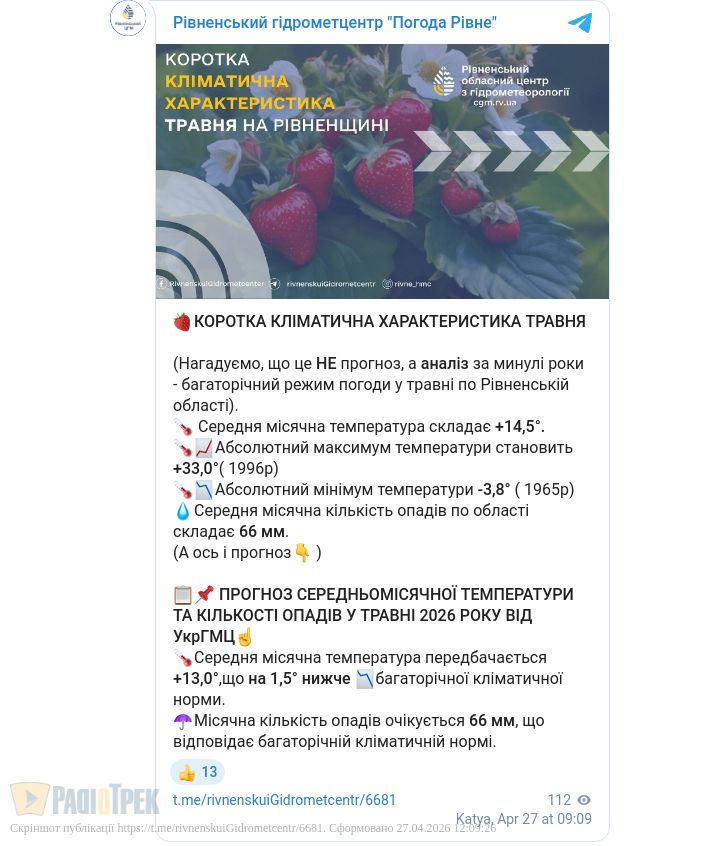 Середня місячна темпертура повітря буде на рівні +13 градусів, що на 1,5 градуса нижче багаторічної кліматичної норми, повідомили у Рівненському обласному гідрометцентрі.