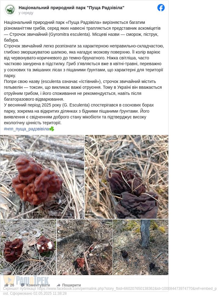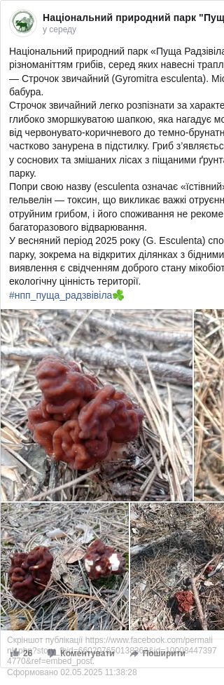 Йдеться про строчки звичайні. Ці гриби мають у своєму складі гельвелін — токсин, що викликає тяжкі отруєння. У зв’язку з цим його не рекомендують для вживання, навіть після багаторазового відварювання. Про це повідомили у Нацпарку «Пуща Радзівіла».
