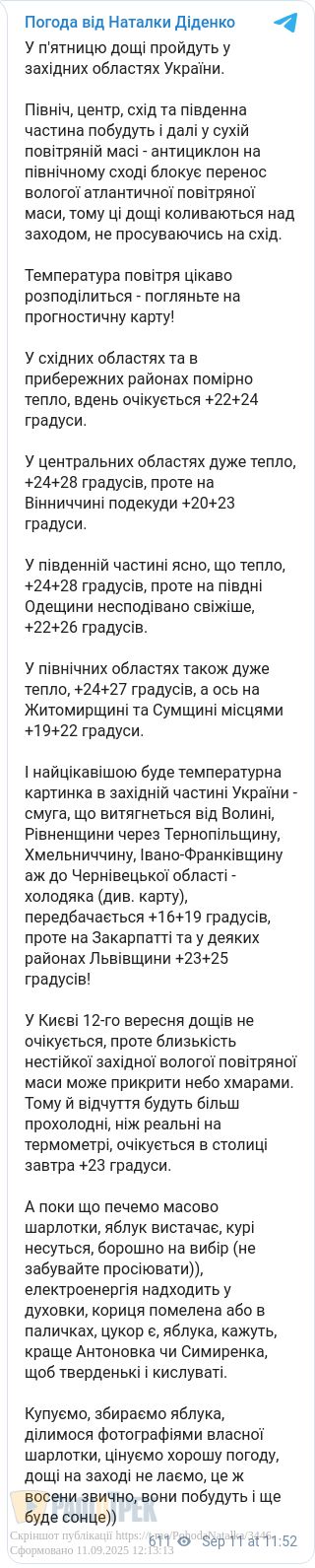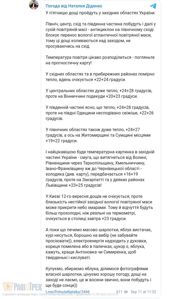 У п’ятницю, 12 вересня, за прогнозом синоптикині Наталії Діденко, дощі очікуються у західних областях України.