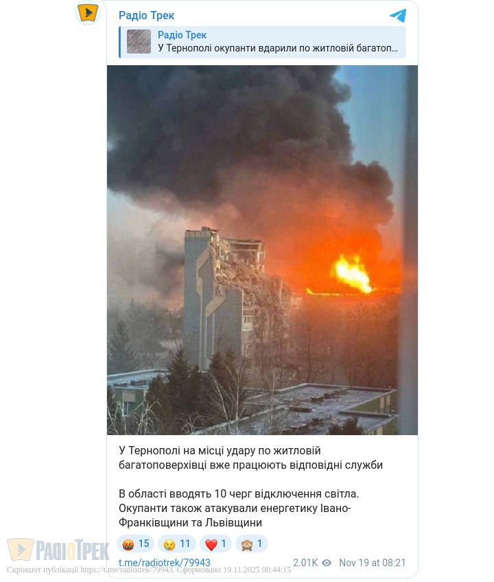 Немає половини багатоповерхівки у Тернополі, Львів затягнуло димом. Під ударами Харків та Дніпро