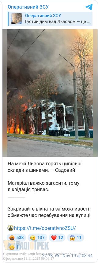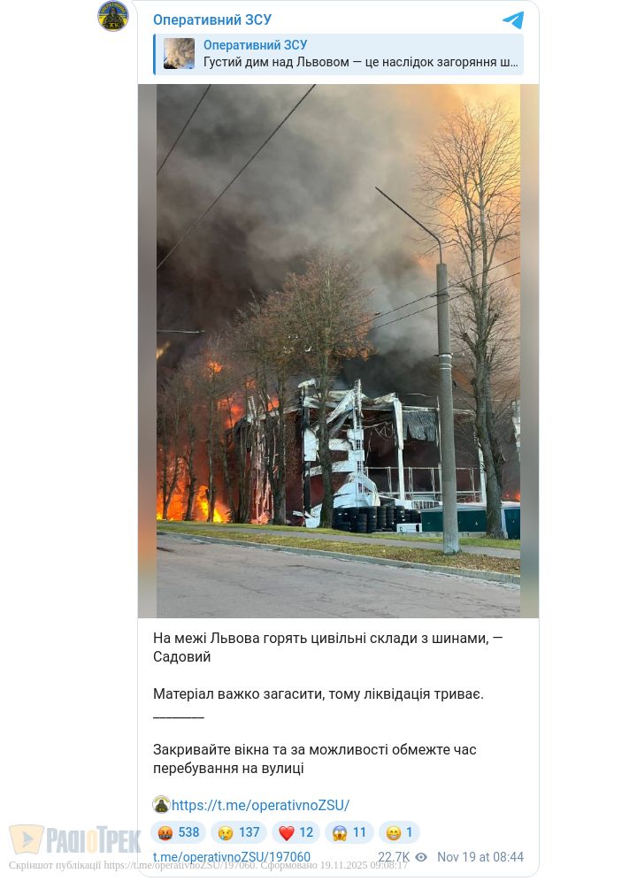 - Унаслідок атаки на Львівщину енергооб'єкт. Також зазнали руйнувань деревообробне підприємство і складське приміщення. За попередніми даними, жертв і потерпілих немає.