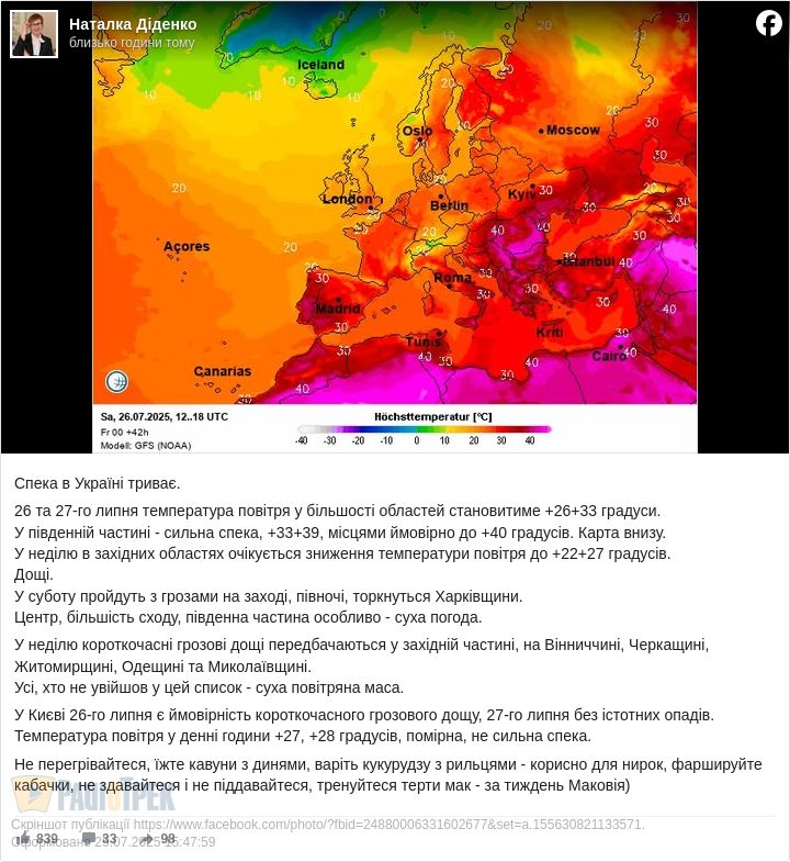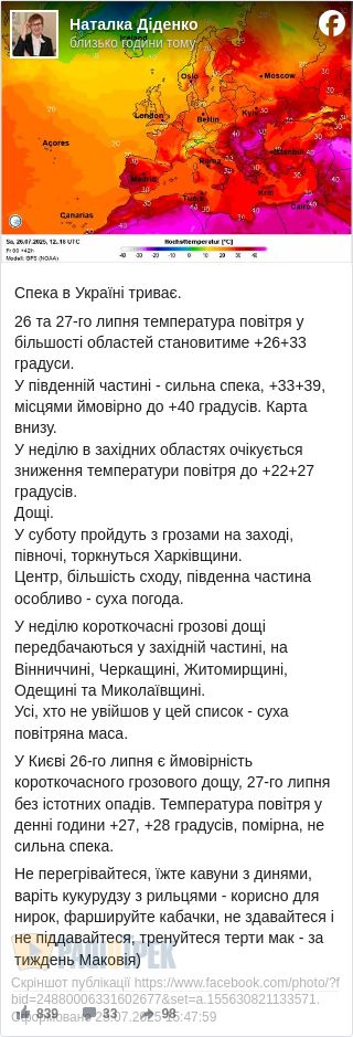 На Півдні очікується до +33....+39, місцями до +40 градусів. У неділю 27 липня на Заході країни очікується зниження температури повітря до +22...+27 градусів, повідомила синоптик Наталка Діденко.