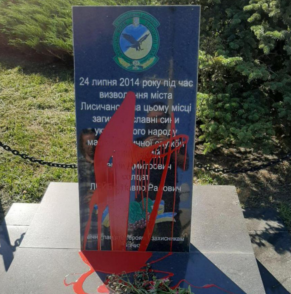 Слідством встановлено, що у ніч з 23 на 24 липня 2020 року невідомі облили фарбою червоного кольору пам’ятний меморіал загиблим під час звільнення міста Лисичанська у липні 2014 року військовослужбовцям Збройних Сил України.