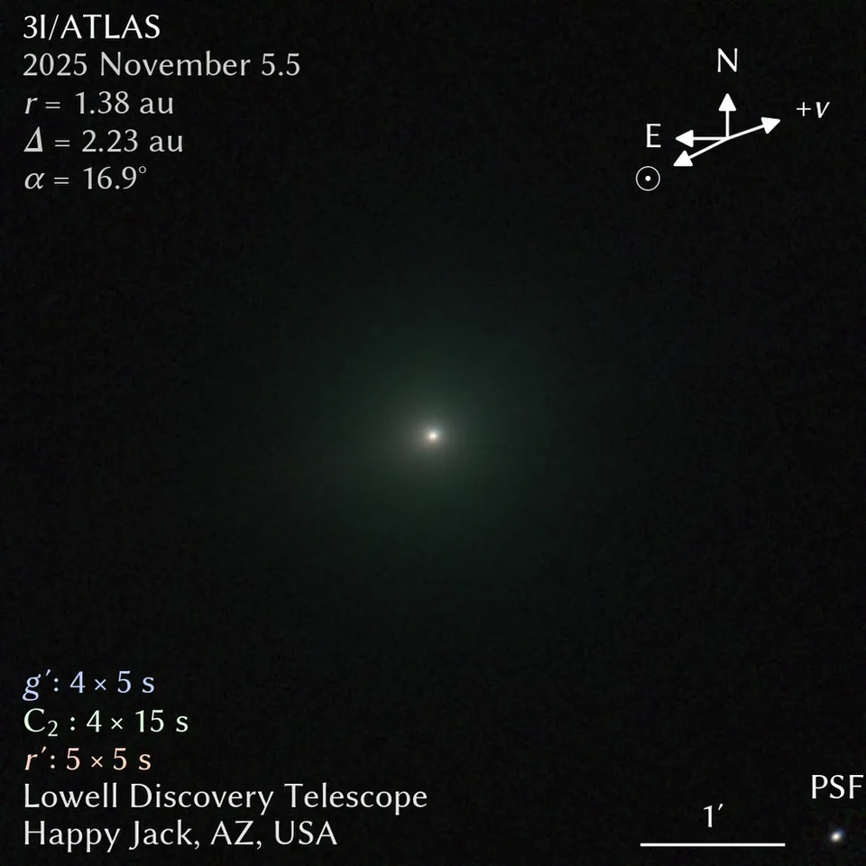 І справді, на нових фото добре помітна кома (хмара пилу й газу, що утворюється навколо ядра комети, коли вона наближається до Сонця), але хвіст розрізнити важко через положення 3I/ATLAS відносно Землі.