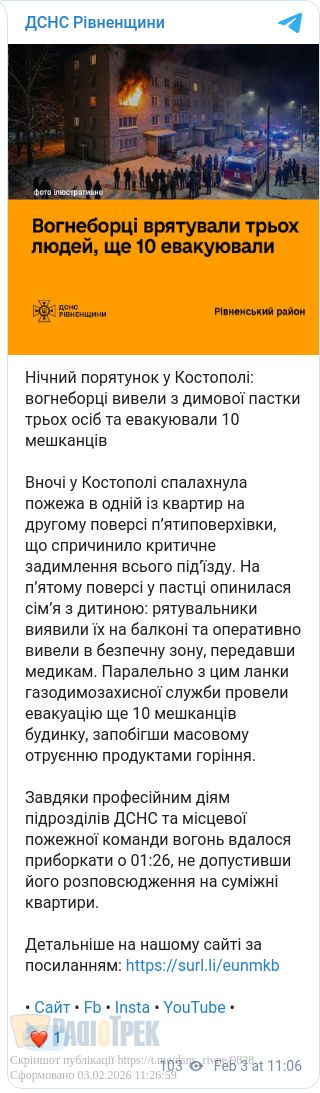 У ніч на 3 лютого в Костополі сталася пожежа в багатоквартирному житловому будинку на вулиці Рівненській. Повідомлення до Служби порятунку «101» надійшло 2 лютого о 23:39.