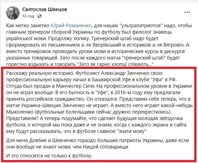 Наприклад, Олександр Зінченко – кращий гравець матчу «Україна - Швеція», свого часу грав за російський клуб «Уфа» і свідомо відмовився від громадянства Росії, коли йому це запропонували.