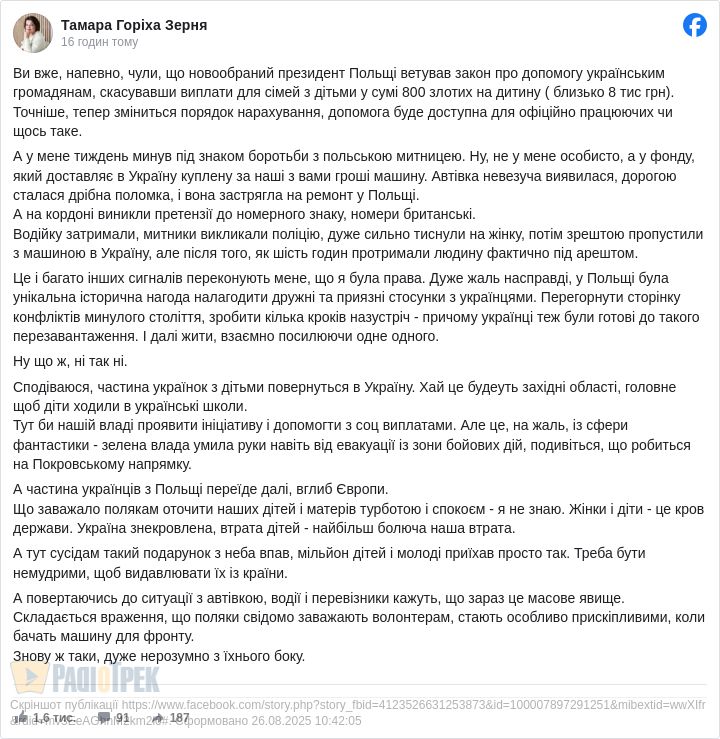 Тамара Горіха Зерня — українська письменниця, перекладачка та волонтерка, лауреатка Національної премії України імені Тараса Шевченка 2022 року, авторка роману «Доця» висловилася на тему нещодавніх рішень нового президента Польщі та розповіла про свою особисту історію. Подаємо її допис практично без змін: