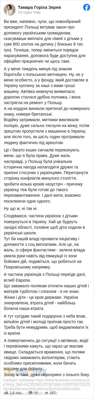 Горіха Зерня розповіла, що водійку затримали, митники викликали поліцію, дуже сильно тиснули на жінку, потім зрештою пропустили з машиною в Україну, але після того, як шість годин протримали людину фактично під арештом.