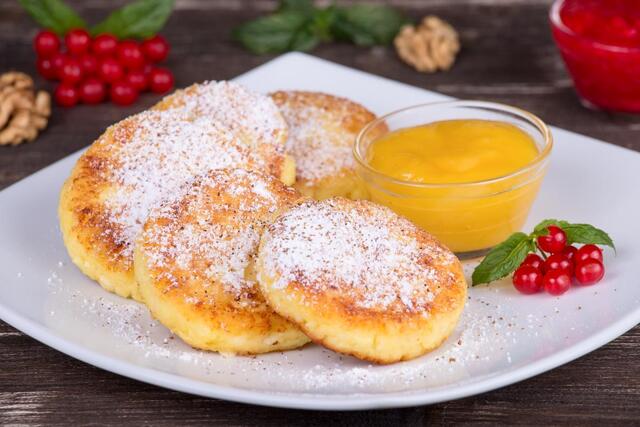 Готові сирники варто подавати гарячими, посипавши цукром або разом із варенням, сметаною чи медом.