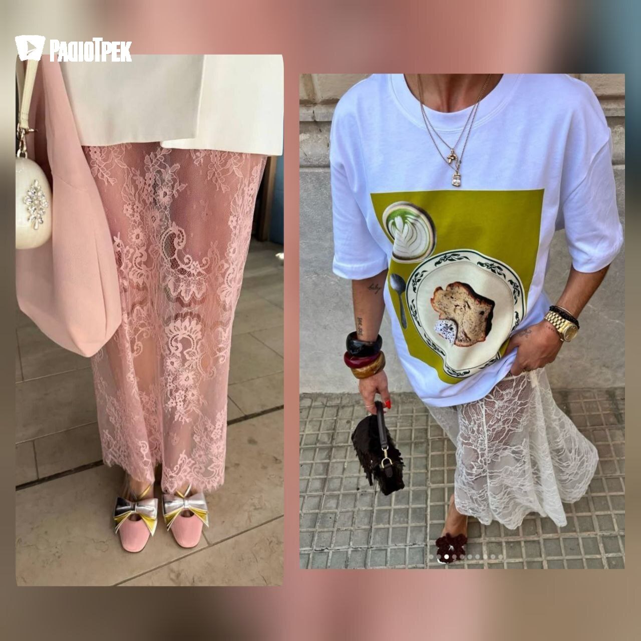 Мереживо має чудовий вигляд в контрастних образах. Наприклад, мереживний топ із джинсами чи шкіряною спідницею створює баланс жіночності та сили. Кольори та варіанти Окрім класичних відтінків, актуальне кольорове мереживо — блакитне, зелений мох, карамель. Вони додають свіжості та стилю.