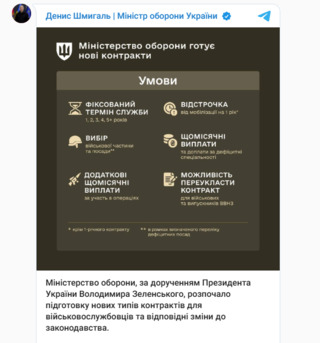 Міністерство оборони працює над оновленням системи комплектування війська. Замість класичної мобілізації пропонують запровадити контракти з фіксованим терміном служби — від 1 до 5 років. Про це повідомив у своєму Телеграмі Міністр оборони Денис Шмигаль.