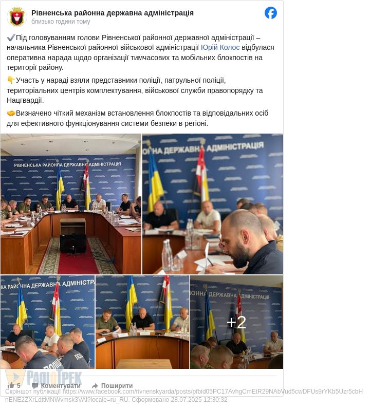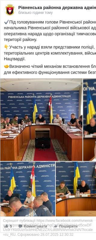 Про це повідомили у Рівненській РДА після наради за участі поліції, ТЦК, Нацгвардії та інших силових структур.