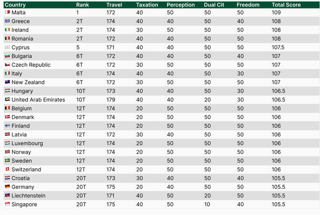 Згідно з оновленим Індексом паспортів на 2026 рік, Мальта отримала перше місце з рейтингом 109. Країна поєднує гнучкий податковий режим із ліберальними правилами подвійного громадянства, що робить її привабливою для підприємців, інвесторів та сімей, які прагнуть мати доступ до ЄС.
