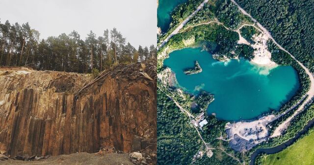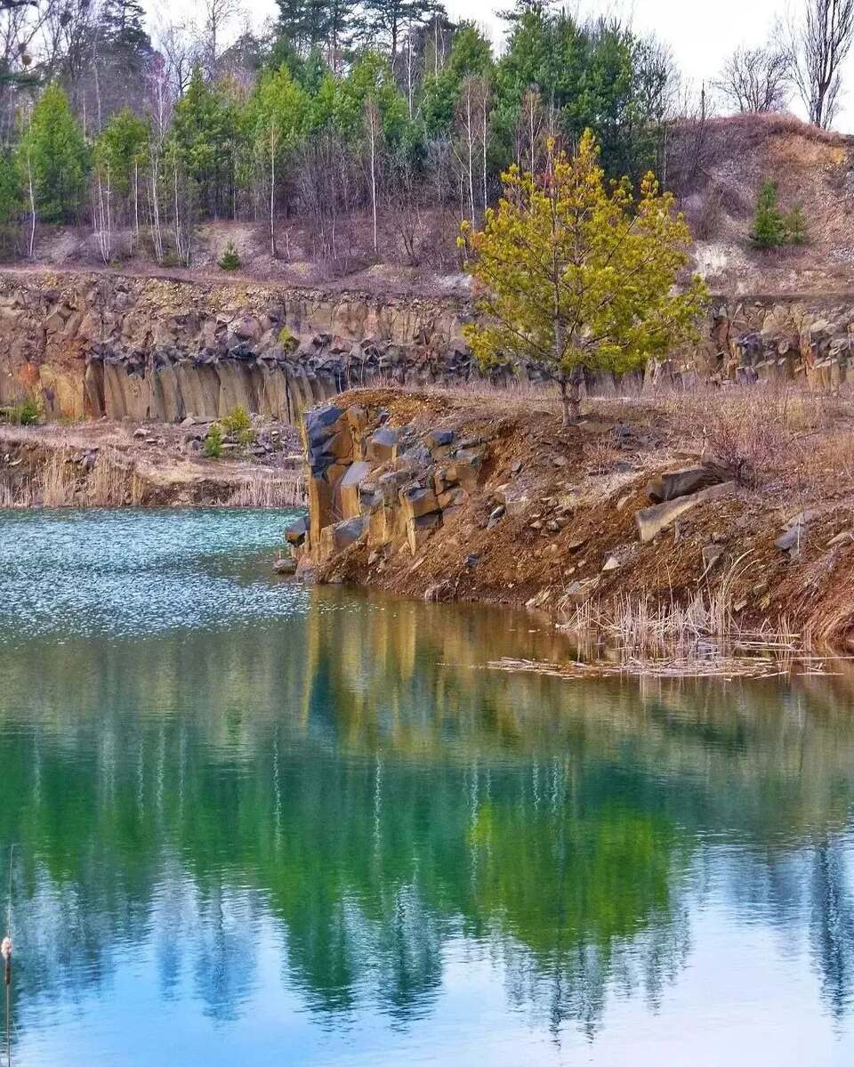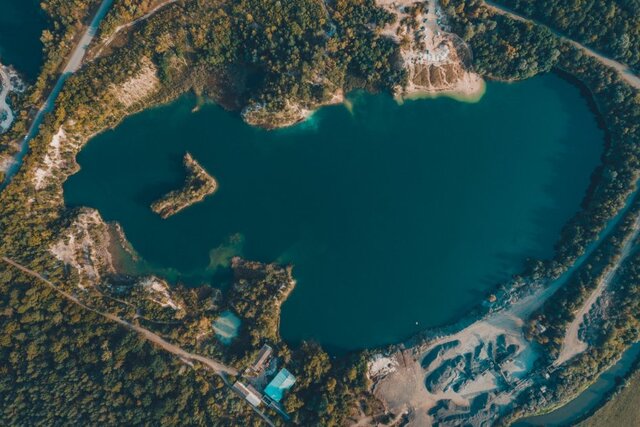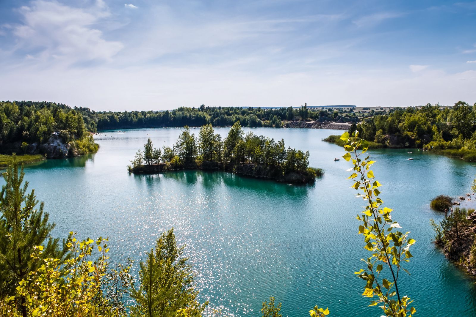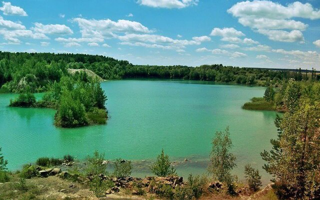 - Озеро у кар’єрі з чистою бірюзовою водою, піщані пляжі.