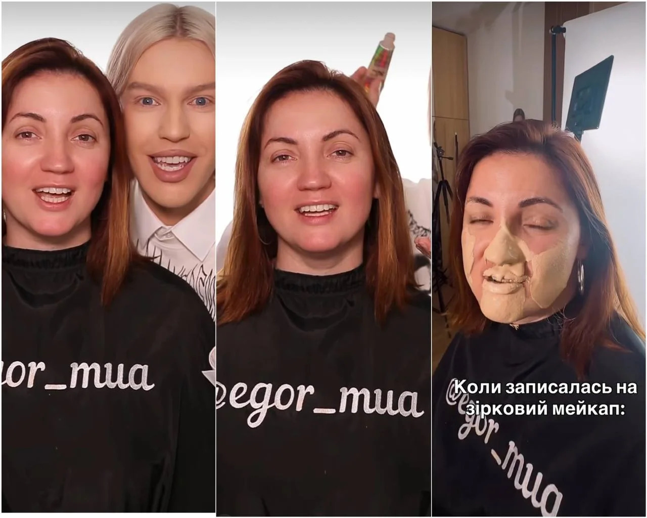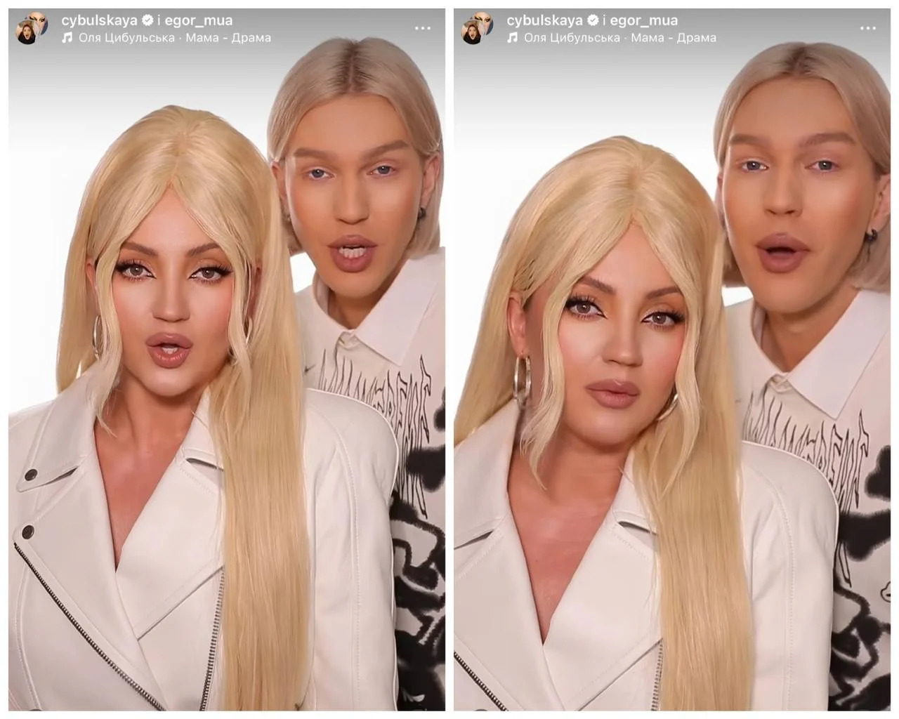Спочатку артистка з’явилася перед камерою без макіяжу, а сам процес перевтілення розпочався з жартів — Андрюшин навіть імітував нанесення великої кількості тонального крему.