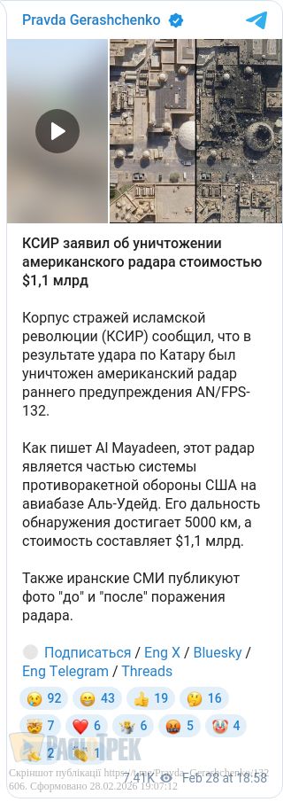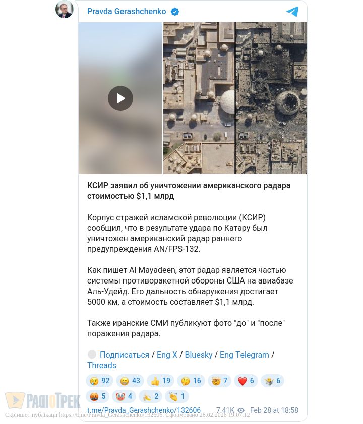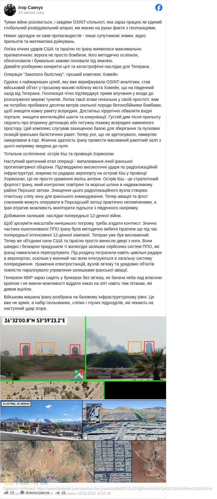 Наступний критичний етап операції - випалювання очей іранської протиповітряної оборони. Підтверджено високоточні удари по радіолокаційній інфраструктурі, зокрема по радарах аеропорту на острові Кіш у провінції Хормозган.
