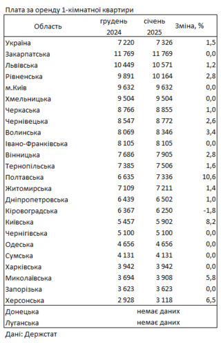 Середня плата за місячну оренду 1-кімнатної квартири в січні 2025 року склала 7 326 гривень. За останній місяць ціни зросли на 1,5%. Про це повідомляє Радіо Трек з посиланням на Державну службу статистики.