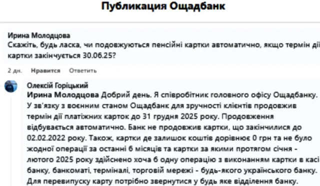 Скажіть, будь ласка, чи подовжуються пенсійні картки автоматично, якщо термін дії картки закінчується 30.06.25?, — написала Ірина Молодцова на сторінці фінансової установи у соціальній мережі «Фейсбук».