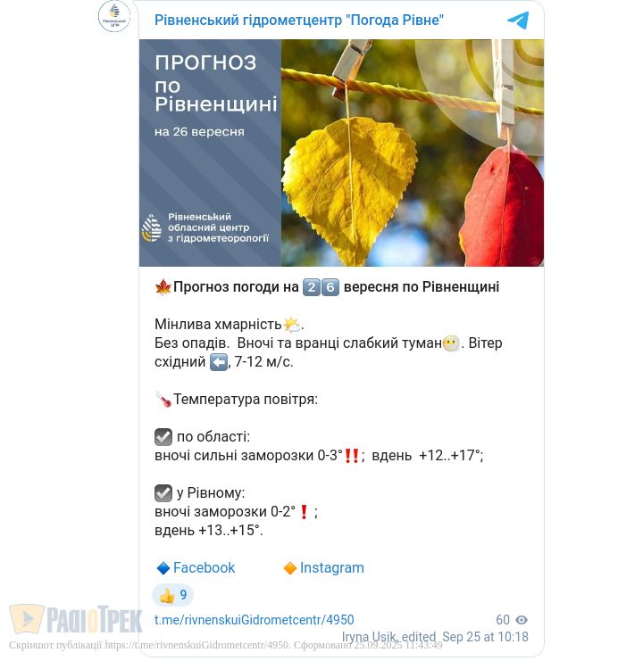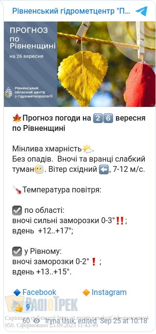 Осінь набирає обертів: вночі на Рівненщині буде до 3 градусів морозу