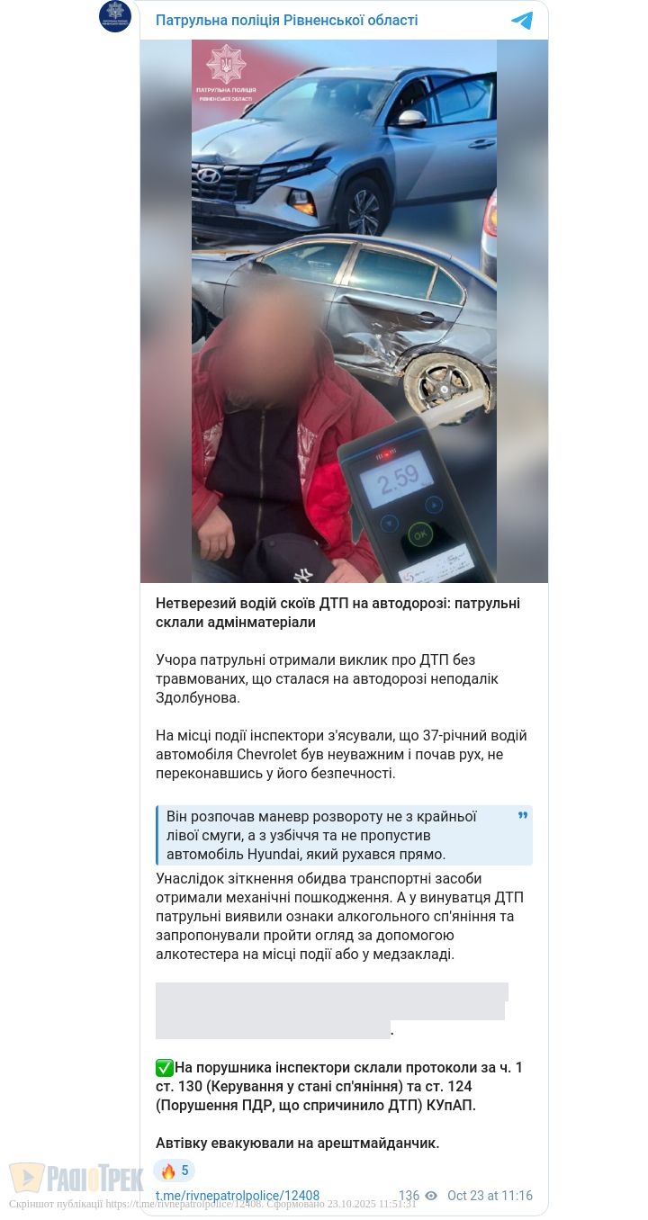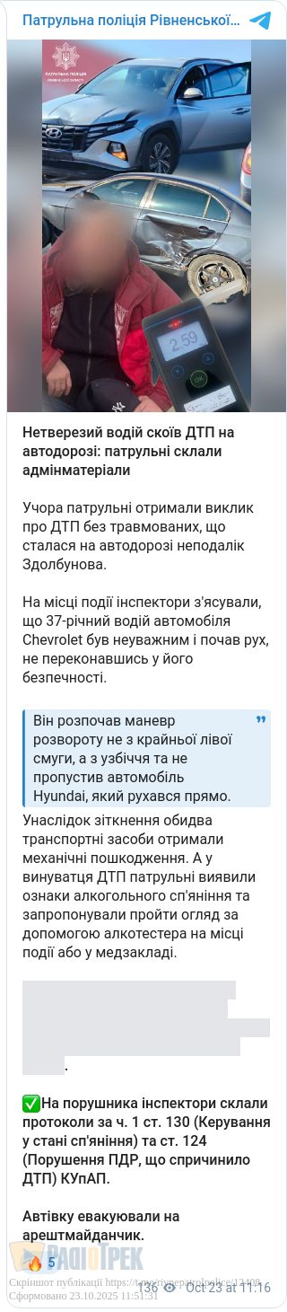 П'яний водій скоїв ДТП на Рівненщині. Інцидент стався вчора, неподалік Здолбунова.