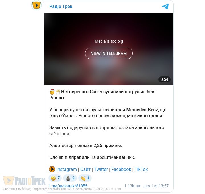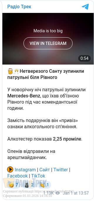 Нетверезого Санту зупинили патрульні біля Рівного. У новорічну ніч патрульні зупинили Mercedes-Benz, що їхав об’їзною Рівного під час комендантської години.