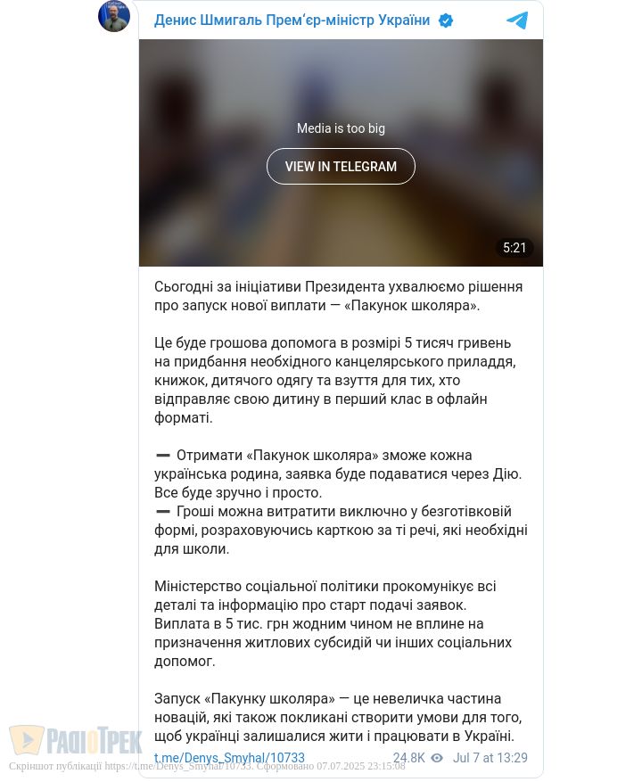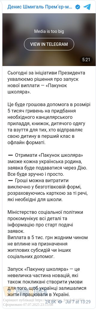 «Пакунок школяра» — це 5000 гривень на кожного першокласника, які можна буде отримати через «Дію» і витратити на навчальні потреби. Допомога призначена для всіх українських родин та є ще одним кроком у розширенні соціальної підтримки від держави. Слідкуйте за оголошеннями Мінсоцполітики, щоб не пропустити старт програми.