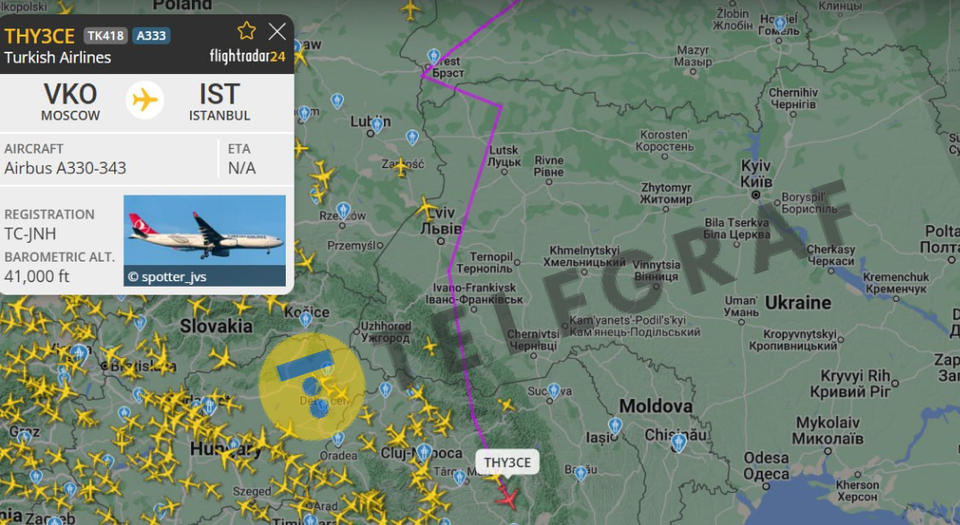 Рейс THY3CE/ТК418 авіакомпанії Turkish Airlines вилетів із Москви та перетнув повітряний простір України. За даними Flightradar24, борт міг пролетіти спочатку Білорусь, а потім перетнути повітряний простір України.