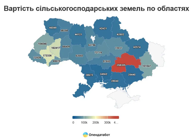 Загалом ціни на гектар землі по областях коливаються в середньому від 34 562 до 358 305 грн. Тобто, вартість 1 га в найдорожчій області дорівнює понад 10 га в найдешевшій.