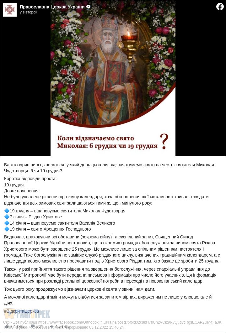 «Водночас, враховуючи всі обставини (зокрема війну) та суспільний запит, Священний Синод Православної Церкви України постановив, що в окремих громадах богослужіння за чином свята Різдва Христового може бути звершене 25 грудня.