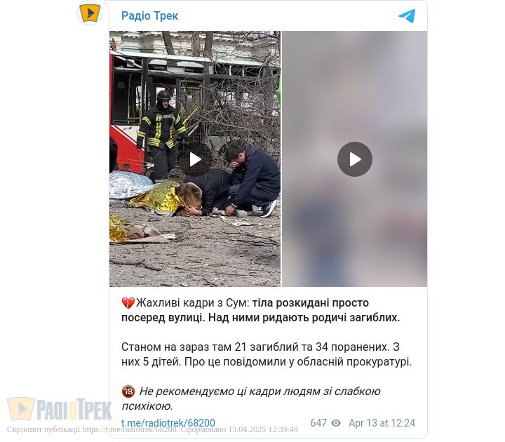 Забираючи життя у звичайних людей. Мої співчуття рідним і близьким. Зараз триває рятувальна операція. Всі необхідні служби працюють.