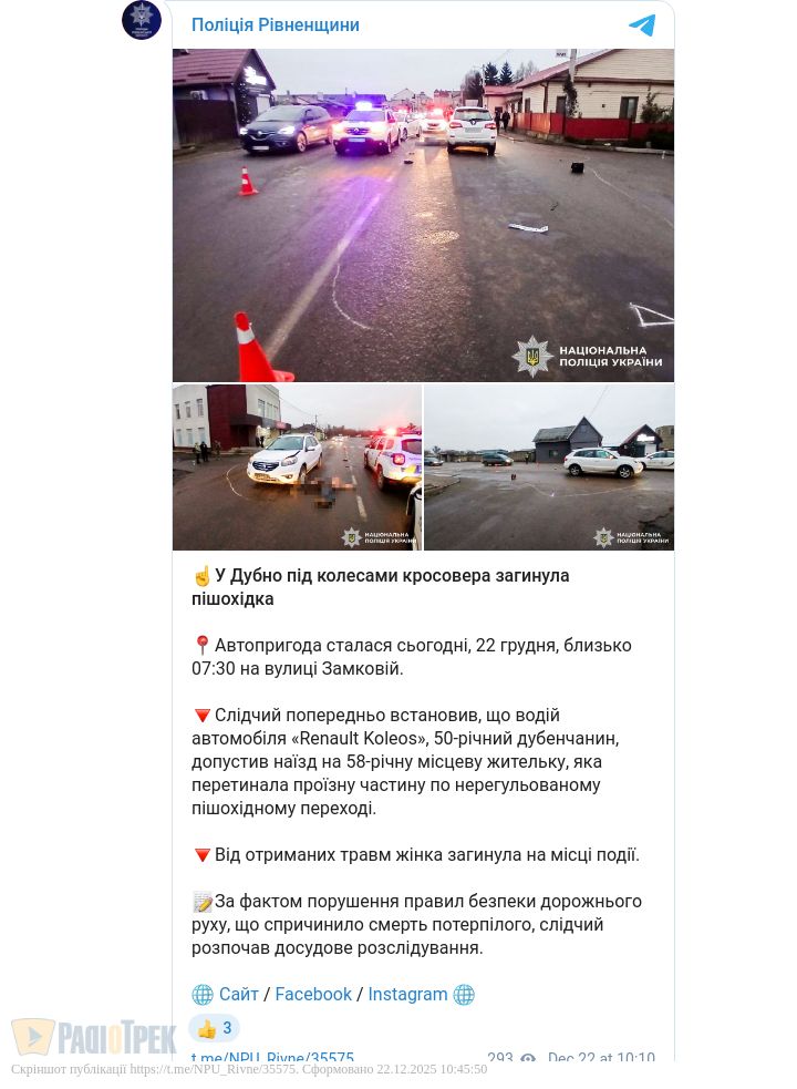 Слідчий попередньо встановив, що водій автомобіля «Renault Koleos», 50-річний дубенчанин, допустив наїзд на 58-річну місцеву жительку, яка перетинала проїзну частину по нерегульованому пішохідному переході.