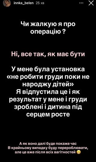 Форма зараз тримається добре, але шрами дуже потемніли. Форма гарна, але ж тут запитання — скільки я наберу ваги, який вигляд груди матимуть після мого схуднення, чи зможу годувати дитину груддю — це все відкриті питання, — поділилася Інна.